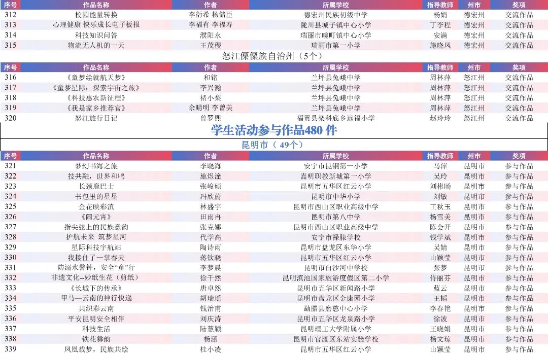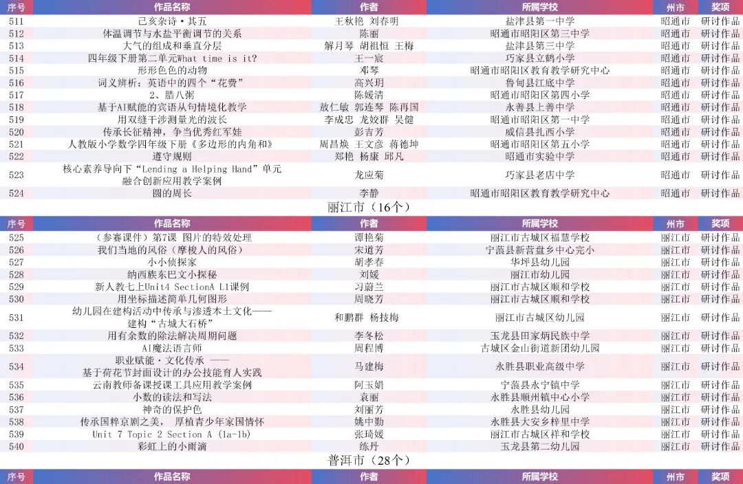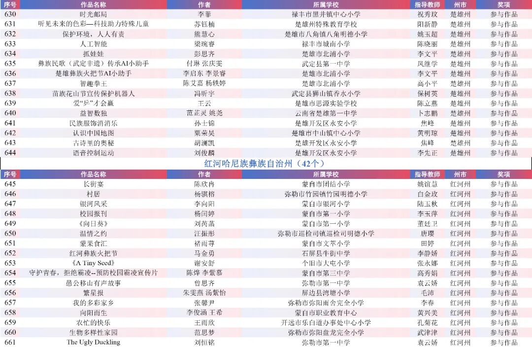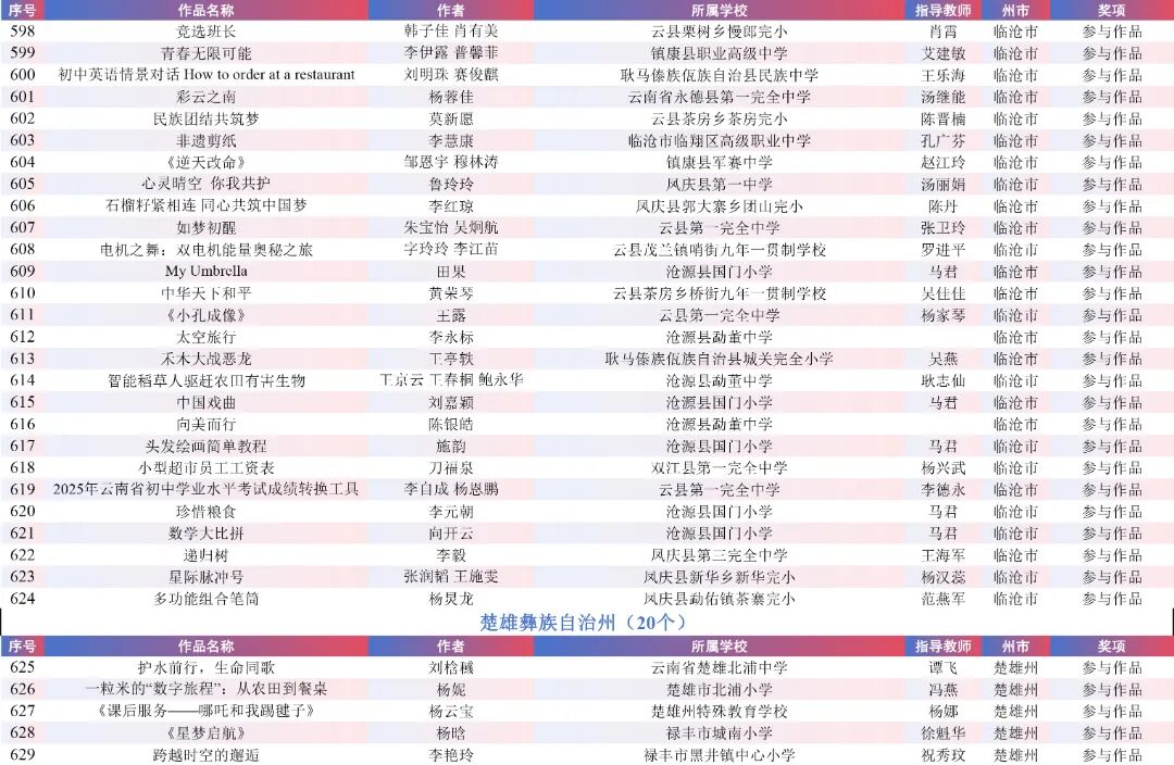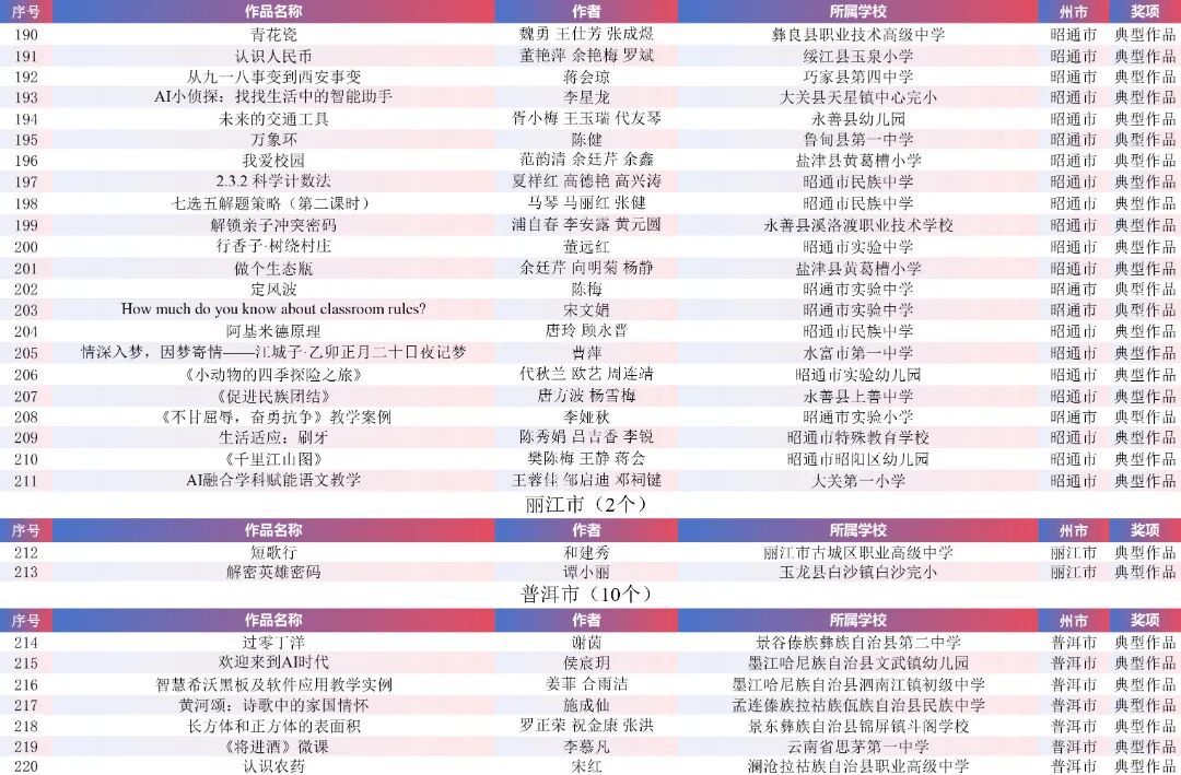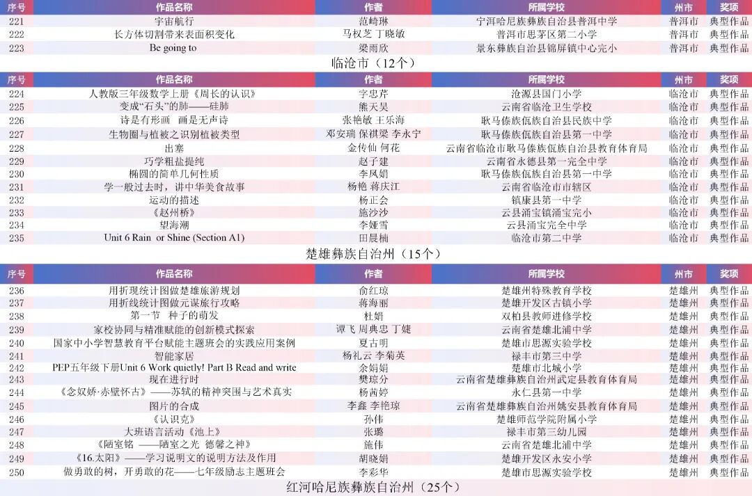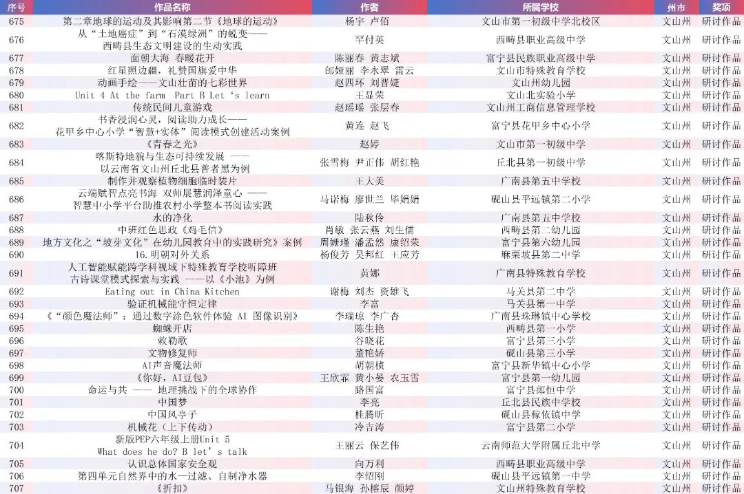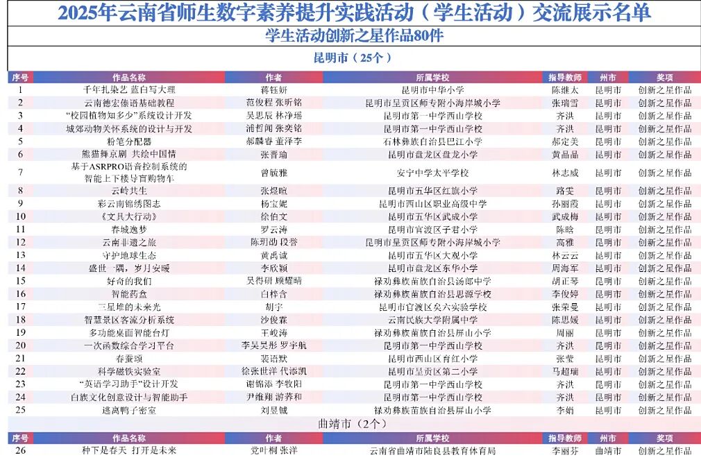 9月15日,云南省教育厅公示了“2025年云南省师生数字素养提升实践活动交流展示名单”。经各州市推荐,专家线上遴选、线下集中复审等,共推荐出教师活动80件创新作品、240件典型作品、480件研讨作品;学生活动80件创新之星作品、240件交流作品、480件参与作品。现将名单予以公示。