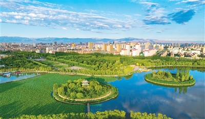 雨后初晴的甘肃省张掖国家湿地公园碧水蓝天,绿意盎然,景美如画。