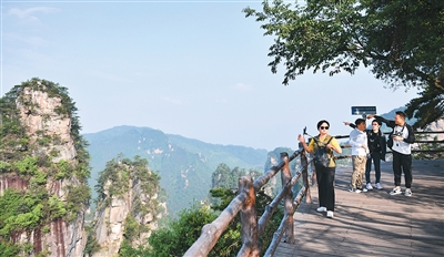 韩国游客在湖南张家界国家森林公园黄石寨景区游览。