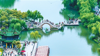 随着“苏超”破圈,江苏扬州借势发力,推出“看球+赏景”文旅套餐,图为游客在瘦西湖风景区赏景游玩。周社根摄(人民图片)