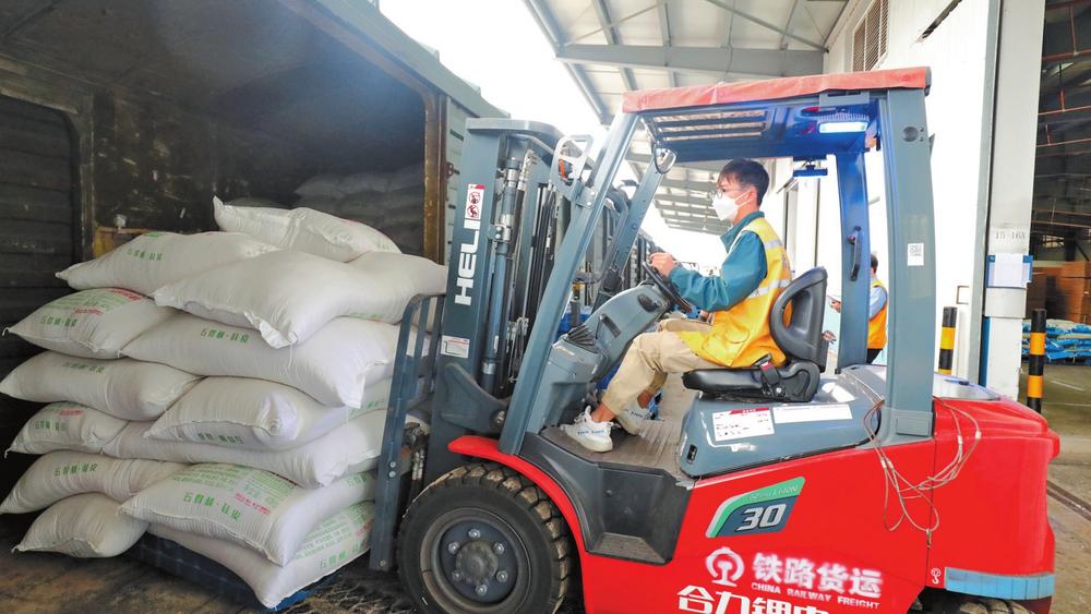 中老铁路宁洱站工作人员在卸车作业。 本报通讯员 杨媚 高夏龙杰 杨廷荣 摄