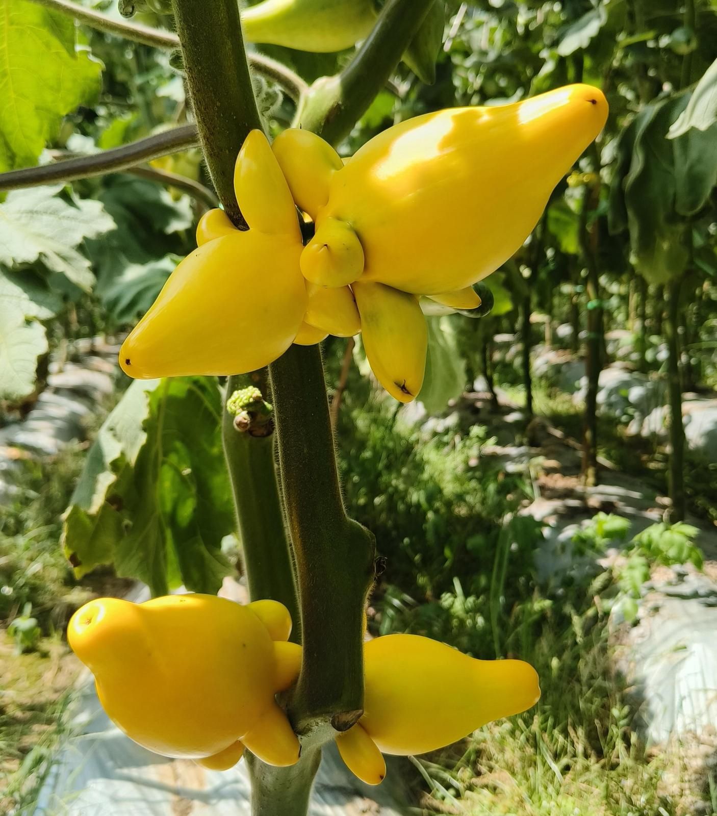 “这是五代果,也叫黄金果、五指茄、乳茄,属于茄属直立草本植物。由于外形长得像动画片《小猪佩奇》里的‘佩奇’,大家都叫它‘小猪佩奇’。”云南铭洋花卉种植有限公司基地厂长和晶华笑着解释。五代果呈倒梨状,成熟时为金黄色,色泽鲜艳。别看它长得可爱讨喜,却只能观赏不能食用。它是优良的观果植物,自然风干后可保持数月色泽鲜艳、形态完好,不易变色干缩,常用于切花和盆栽装饰,还因“五代同堂、五福临门、金玉满堂”的美好寓意备受喜爱。