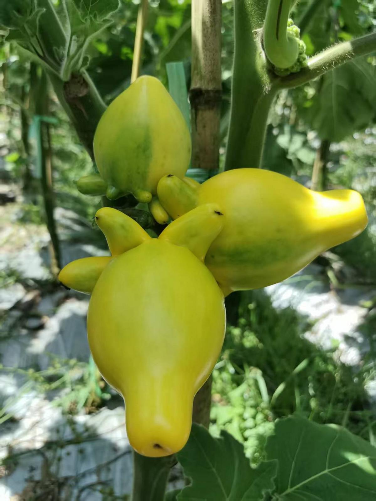 这种植物原产于美洲热带地区,如今已在云南、广东、广西等地扎根。和晶华说:“五代果生长周期约6个月,文山首批五代果将于10月上市,能卖到12月。植株高两米左右,呈两枝分叉生长,每枝都挂着‘小猪佩奇’,一枝能卖10元到30元,整株或单个售卖都不浪费。”
