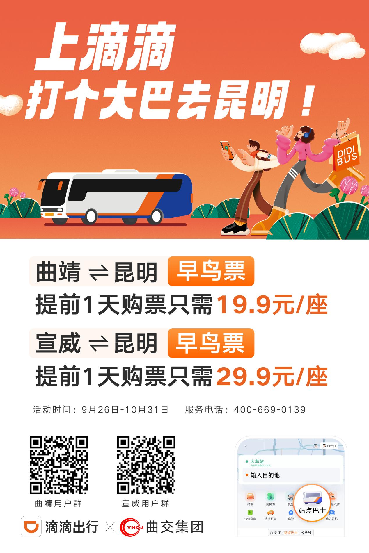 开屏新闻记者获悉,9月26日起,曲靖交通集团携手滴滴出行开通昆明往返曲靖、宣威的滴滴站点巴士客运专线。此举将更好地满足旅客“点对点、门对门”的出行需求,为广大旅客提供差异化、精准化、高端化的服务。