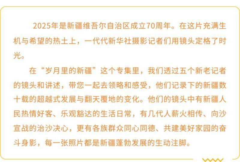 今年是新疆维吾尔自治区成立70周年。沧海桑田,从帕米尔高原到塔里木盆地,从莽莽昆仑山到神秘悠远阿尔泰山,沙漠绿洲唱新韵,草原牧歌起新声。作为记者,我无数次走过“三山两盆”,透过取景器和新疆相逢、相识、相知,不知不觉已进入第10个年头。十年一瞬,疆影入梦来。