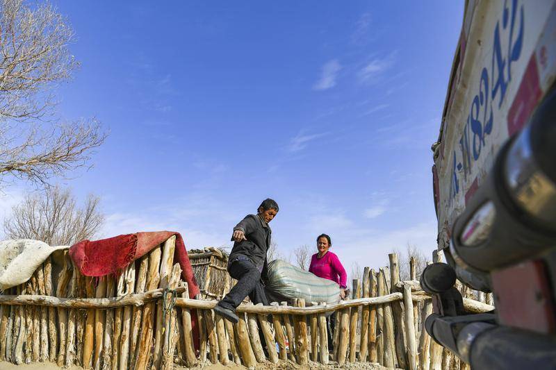 依明·买提库尔班(前)和妻子抬着行李跨出老家的篱笆墙,准备乘车前往安置点(2019年11月17日摄)。