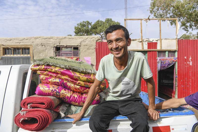 在新疆于田县达里雅布依乡政府驻地附近的村庄,村民热和买提·买买提明在帮助该乡首批易地搬迁贫困户转运行李(2018年9月5日摄)。