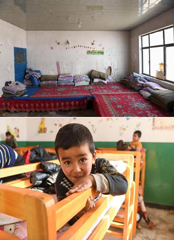 拼版照片:上图为易地扶贫搬迁前的于田县达里雅布依乡学校学生宿舍(2018年9月5日摄);下图为5岁的阿不都沙拉木·库尔班在新学校午休(2019年11月19日摄)。