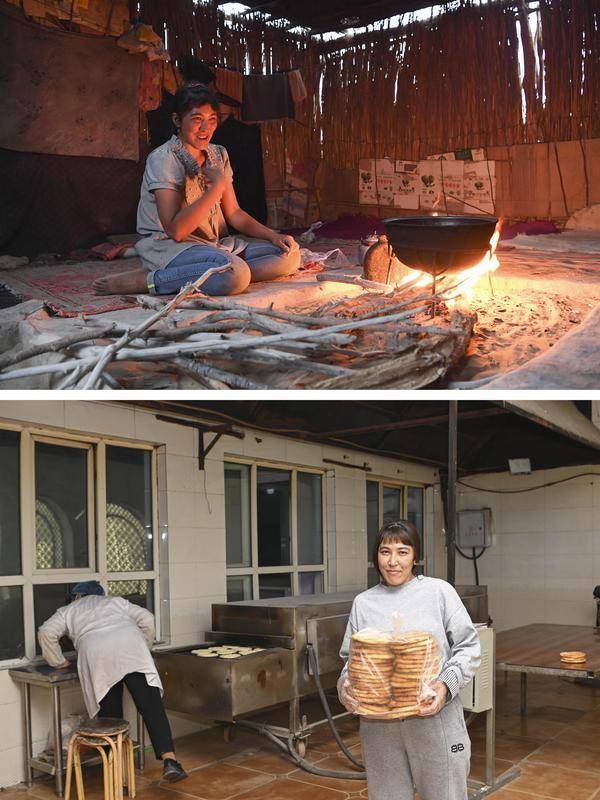 拼版照片:上图为搬迁前,达里雅布依村村民古丽巴哈尔·阿不都拉在家中做饭(2018年9月4日摄);下图为古丽巴哈尔·阿不都拉在于田县的一家打馕店上班(2024年11月11日摄)。