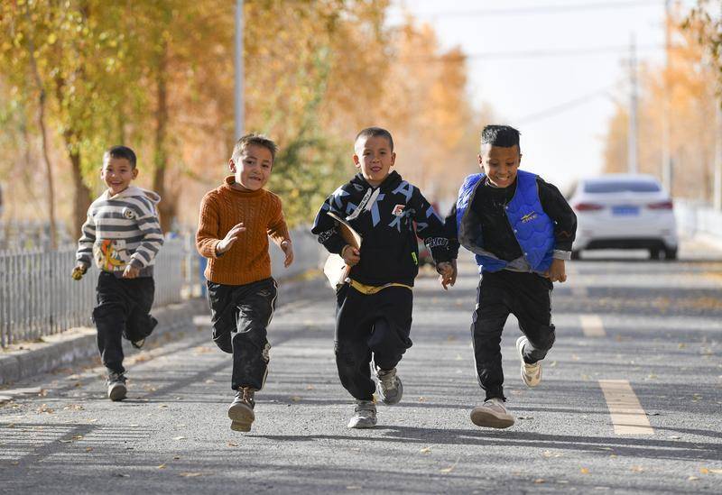 小朋友奔跑在新疆于田县达里雅布依新村(2024年11月9日摄)。