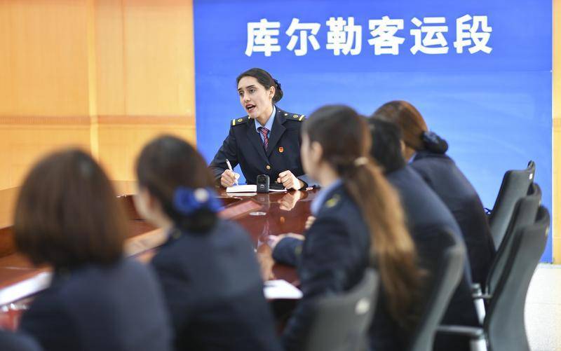 在中国铁路乌鲁木齐局集团有限公司库尔勒客运段办公楼,艾尔开牙·多力开带领同事开展值乘前的业务学习(2025年1月15日摄)。