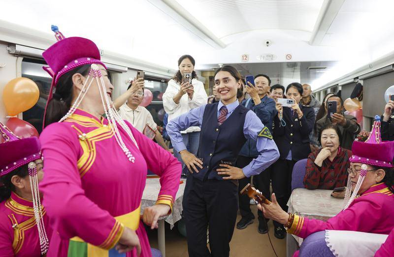在由喀什开往成都西的列车上,艾尔开牙·多力开与民间艺人一起为乘客跳舞(2024年4月19日摄)。