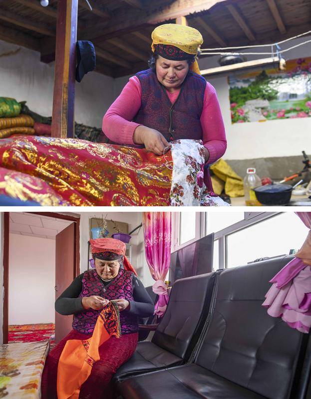 拼版照片:上图为都热·加尔曼的妻子那尼克·苦卡尼在山谷旧居中缝制搬迁后需要使用的新被子(2018年11月13日摄);下图为那尼克·苦卡尼在爱民村的新家中制作手工刺绣(2020年6月3日摄)。