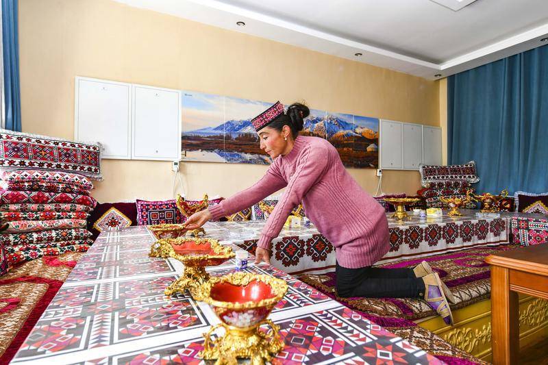 新疆塔什库尔干塔吉克自治县塔什库尔干乡瓦尔希迭村村民玛依努尔古丽·依克木在民宿内摆放物品,准备招待游客(2020年6月4日摄)。