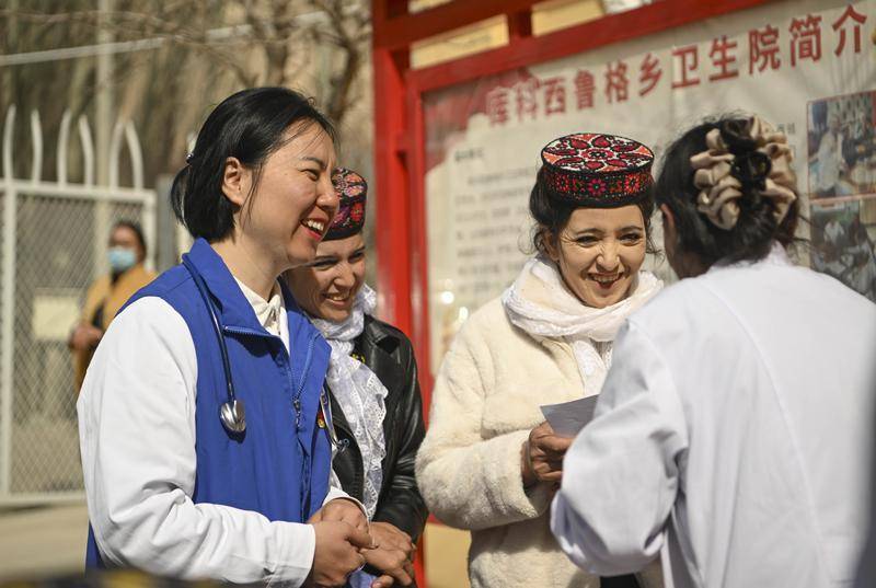 在新疆塔县库科西鲁格乡卫生院,深圳援疆新生儿科医生潘千(左一)与村民、乡卫生院医护人员交流(2025年3月24日摄)。