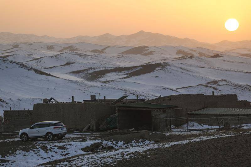 冬牧场上巴哈提家的房屋。屋旁的白色汽车是为庆祝小女儿昆树阿克考上大学所买的礼物。(2023年12月1日摄)