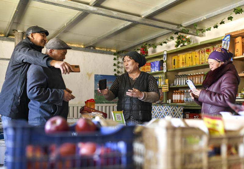 周边牧民来到家中买东西,巴哈提(右二)向顾客展示收款到账界面,和大伙儿聊天(2023年2月15日摄)。