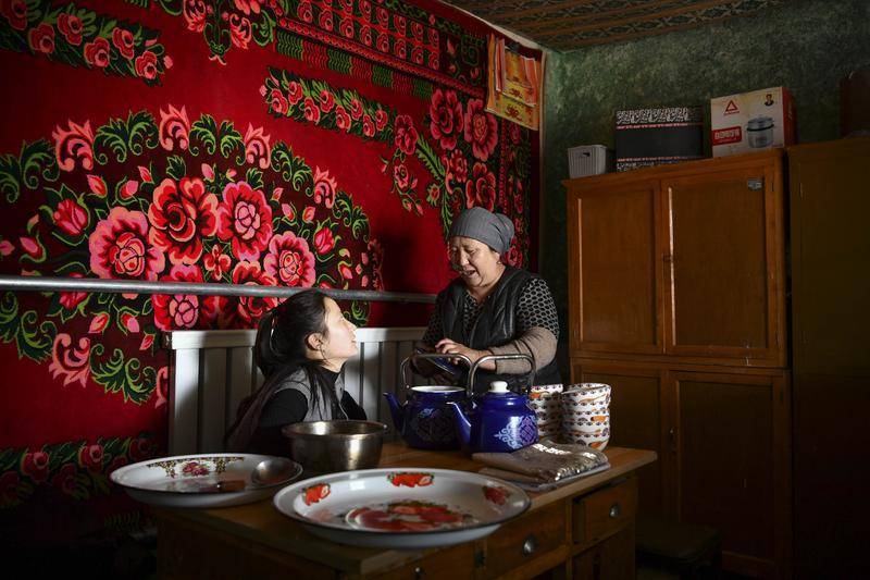 午饭后,巴哈提(右)在家中洗碗,小女儿昆树阿克在一旁依恋地看着母亲,有说有笑(2023年2月12日摄)。身后墙上右上角,挂着30多张昆树阿克所获的奖状。