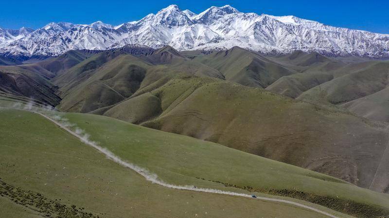 汽车疾驰在位于昆仑山北麓的新疆策勒县一处高山牧场道路上(2019年5月31日摄,无人机照片)。近年来,新疆偏远牧区的出行条件得到改善。