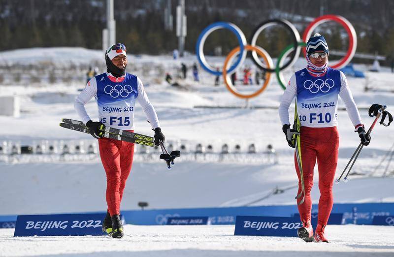 北京2022年冬奥会越野滑雪女子10公里(传统技术)比赛开赛前,试滑员吐尔松江·布尔力克(左)和队友哈那提·吐尔逊离开比赛场地(2022年2月10日摄)。两人都来自新疆北部牧区温泉县。