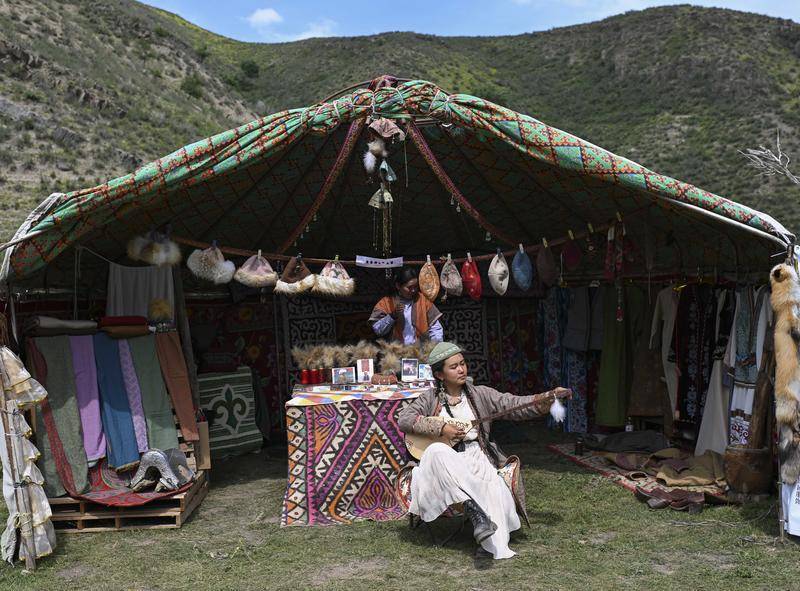 在乌鲁木齐市水磨沟区的“夏牧场·游牧文化旅游节”上,北京姑娘周方怡(前)在展厅前弹奏冬不拉,她的“游牧”文创搭档扎伊拉·也斯达吾列提在身后准备展品(2024年6月15日摄)。