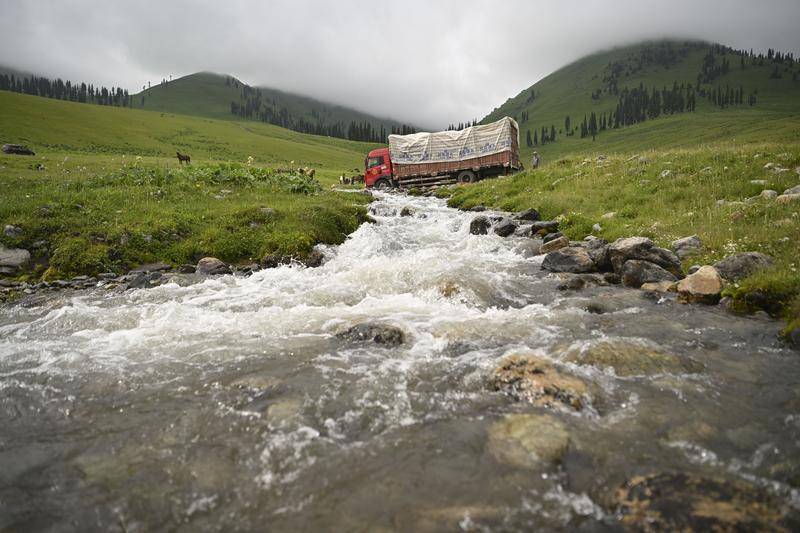 进行机械化转场的牧民开车行驶在新疆那拉提草原深处(2025年6月11日摄)。