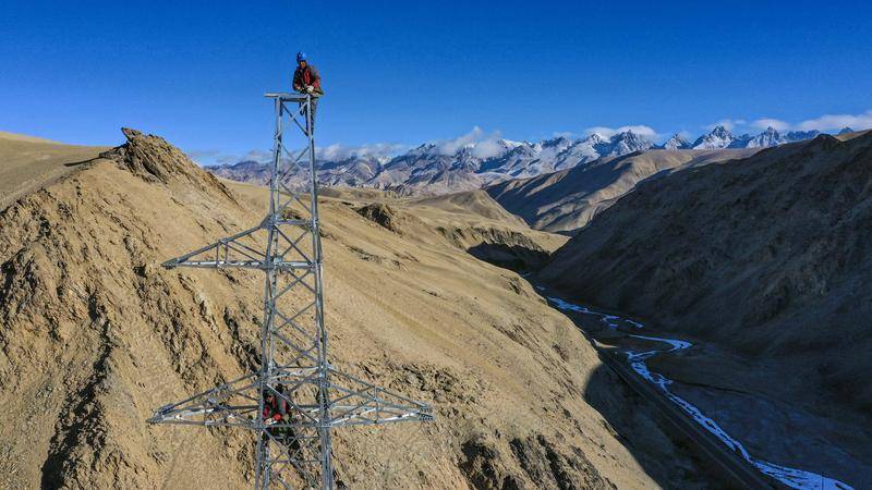 电力工人在新疆塔什库尔干塔吉克自治县的深山中安装用于放线的零件(2019年11月23日摄)。