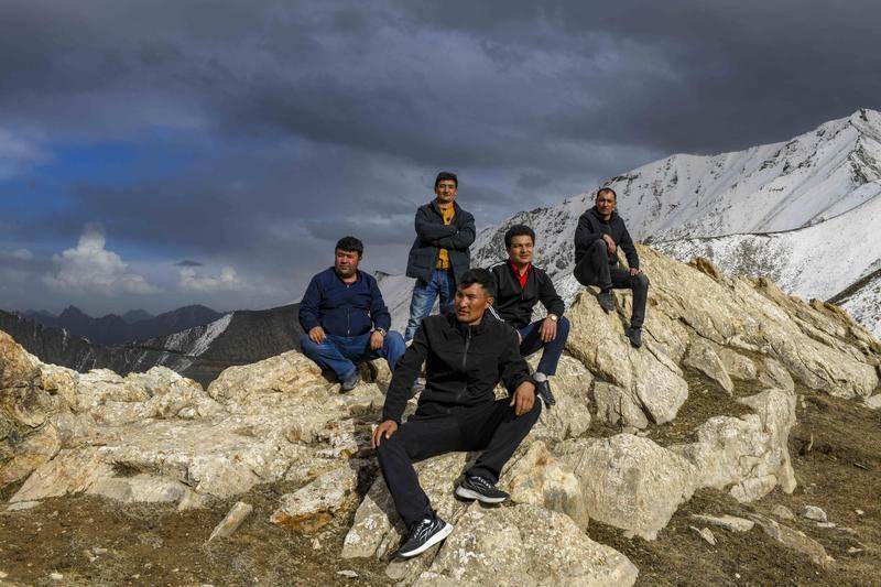 翻越雪山达坂后,参与新疆全民免费体检服务的部分西合休乡卫生院医护人员在山中休息时合影(2020年5月2日摄)。