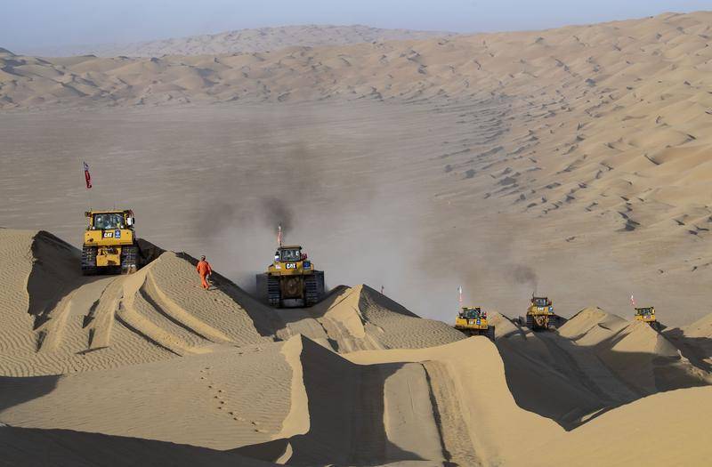 在新疆尉犁至且末沙漠公路建设现场,工人李明友爬过沙丘观察推土机作业进展(2020年5月16日摄)。