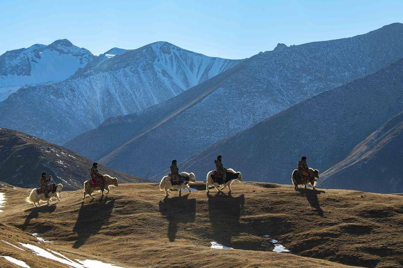 新疆生产建设兵团第三师图木舒克市叶城二牧场三连的干部职工骑着牦牛行进在巡边路上(2020年12月25日摄)。