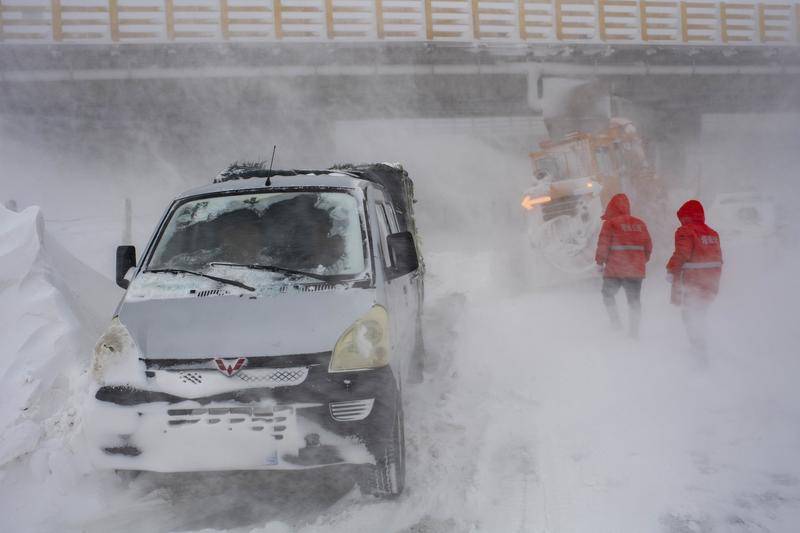 玛依塔斯防风雪抢险基地的工作人员顶风冒雪搜寻被困旅客(2021年1月23日摄)。