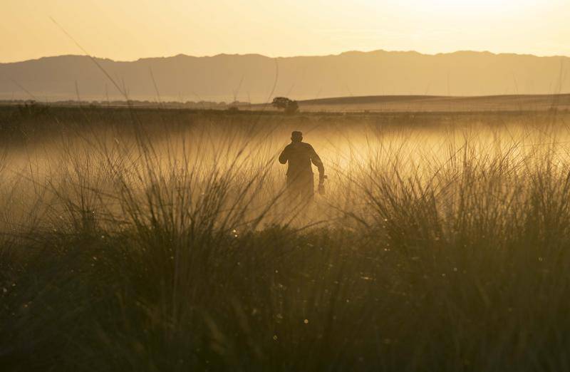 新疆新源县别斯托别乡恰普河加嘠村村民在那拉提草原深处喷洒除毒害草药剂(2018年5月26日摄)。