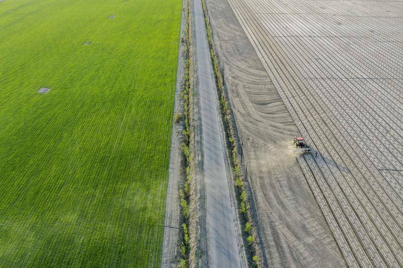 棉农在新疆沙湾市大泉乡五道河子村的棉田春播,一旁的小麦长势良好(2022年4月17日摄)。