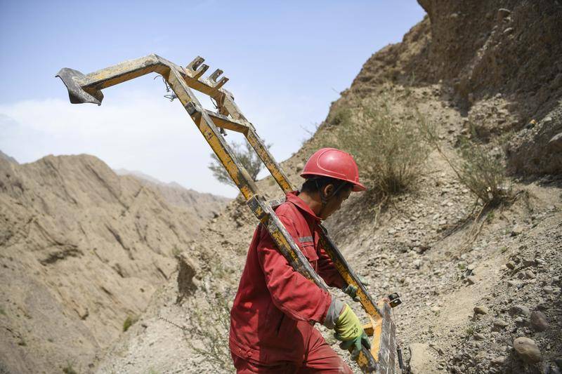 东方物探公司塔里木物探处2170队33岁的钻工谭金龙在峭壁上搬运钻井设备(2023年6月18日摄)。