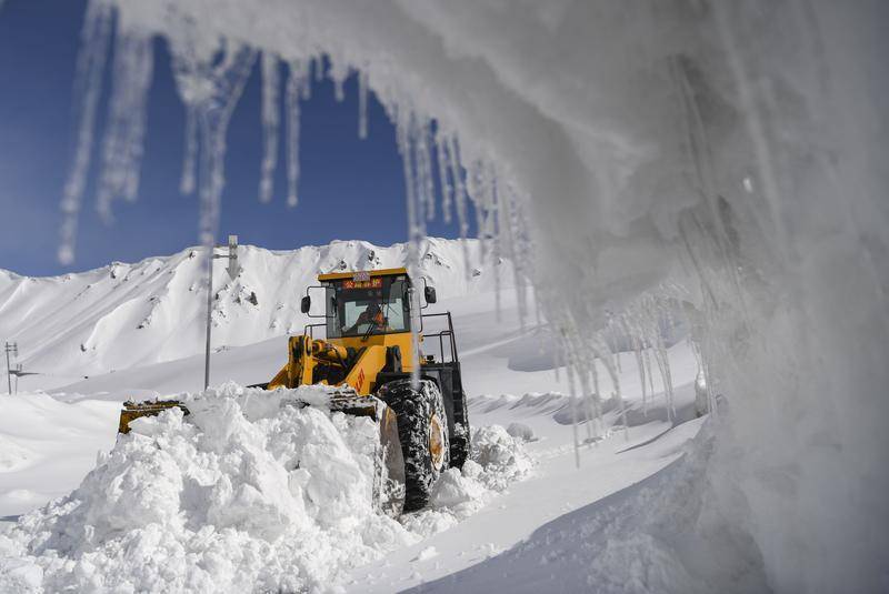 乌兰萨德克养护站工人乌斯曼·巴克驾驶装载机在独库公路的雪崩多发路段上清雪(2023年5月9日摄)。