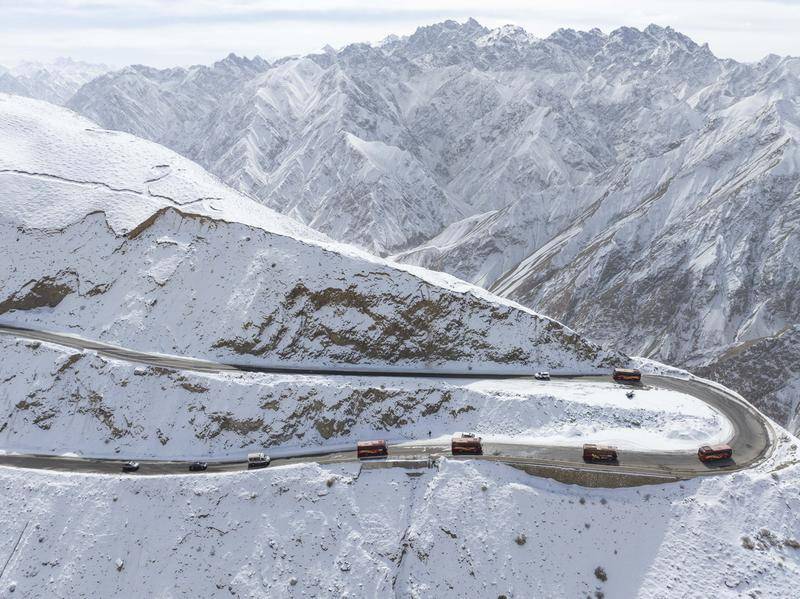 由警车开道、救护车随行的上学车队穿行在昆仑山区,带着西合休乡的初中生前往县城上学(2024年2月26日摄)。
