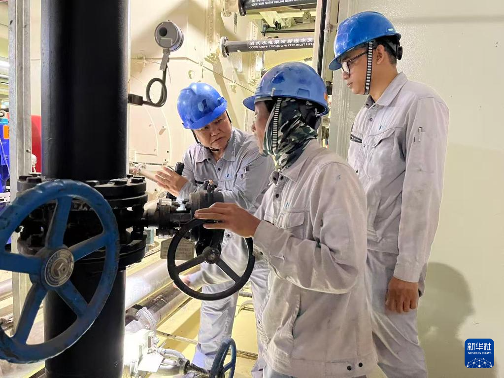 2025年7月2日,在印度尼西亚南苏门答腊省麻拉埃宁县,华电(印尼)玻雅发电公司设备维护部机务一班师傅谈志东(左一)现场指导印尼徒弟度一(左二)和法赫里检查电泵冷油器系统。新华社发(罗江华摄)