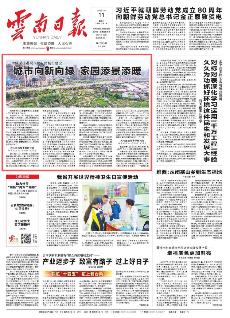 10月11日,云南日报头版头条刊发文章《云南纵深推进现代化人民城市建设——城市向新向绿 家园添景添暖》,报道党的十八大以来,云南坚持人民城市人民建、人民城市为人民,把城市作为有机生命体系统谋划,推动全省新型城镇化水平和城市发展能级、规划建设治理水平、宜业宜居水平、历史文化保护传承水平、生态环境质量大幅提升。