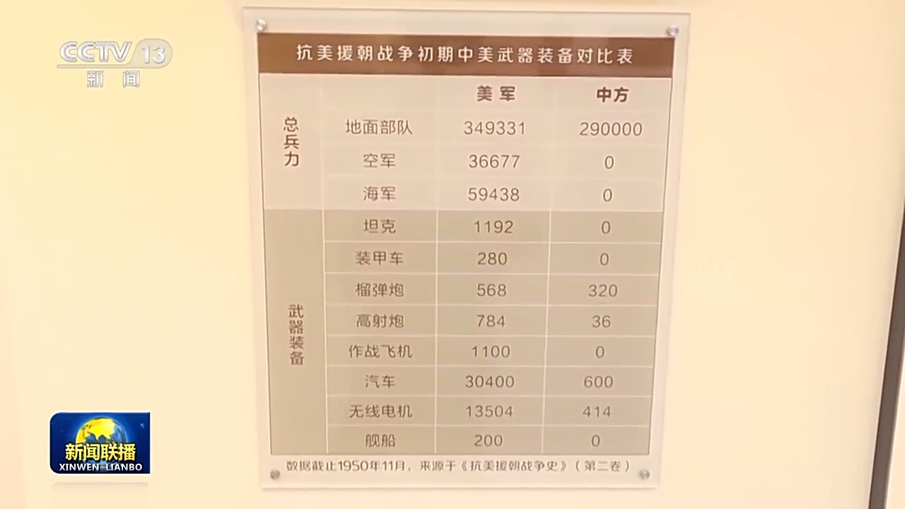 军号响起,使命召唤。在哈军工纪念馆,这张抗美援朝战争初期中美武器装备对比图,震撼着世人。中方空军0、海军0、坦克0、装甲车0、作战飞机0、舰船0……如此悬殊的装备下,中国人民志愿军浴血奋战,顽强战胜强敌。