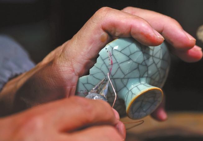 锔瓷是一门需要极致耐心与巧思的技艺,包括设计、錾刻、镶嵌等。付忠华介绍,修复一件器物需经历多道严谨工序:先将碎裂的瓷器拼合固定,随后以金刚钻在裂缝两侧精准打孔,再将金属锔钉嵌入孔中,最后用特制黏合剂黏合缝隙。