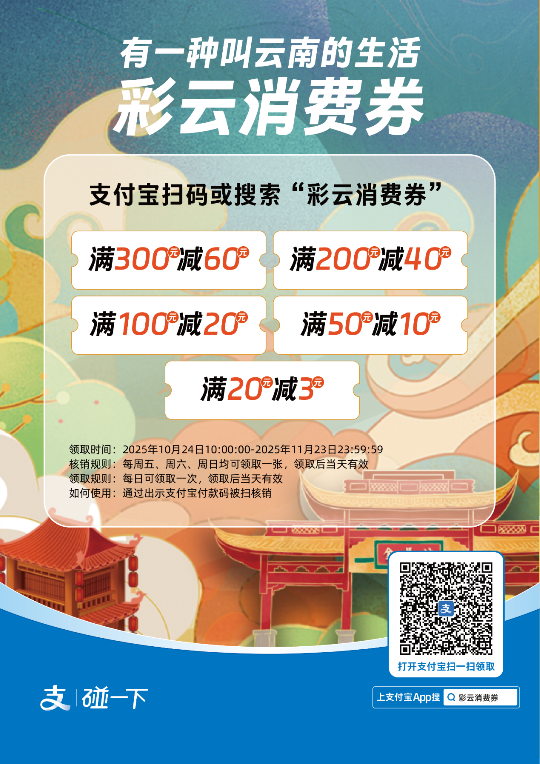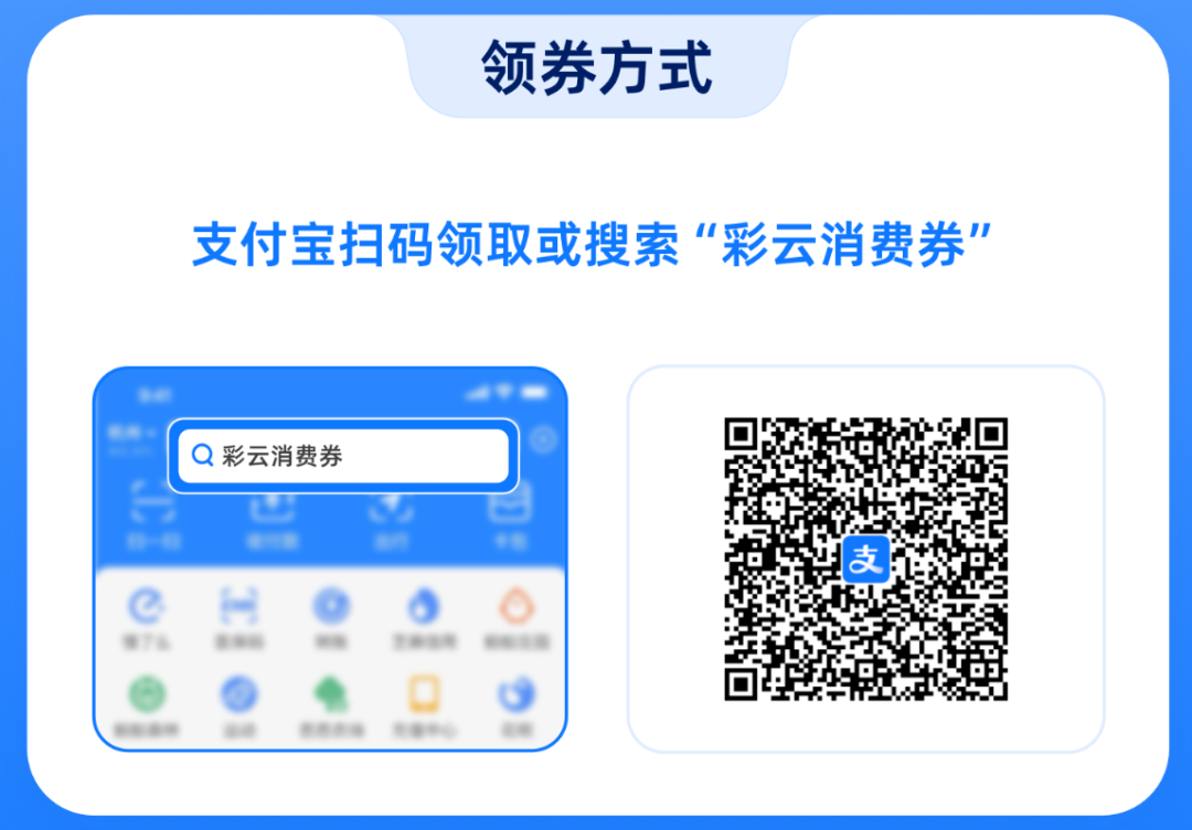 支付宝APP搜索“彩云消费券”或扫码进入活动页面