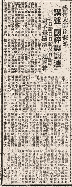 事实上,早在此次讲演约半年之前,徐悲鸿曾受当时的南京政府教育部之邀,通过向广大市民广播讲演的方式,以《当前中国的艺术问题》为主题,做过一次公开讲演。这一讲演,可以视作半年之后的“国粹与国渣”讲演之前奏。