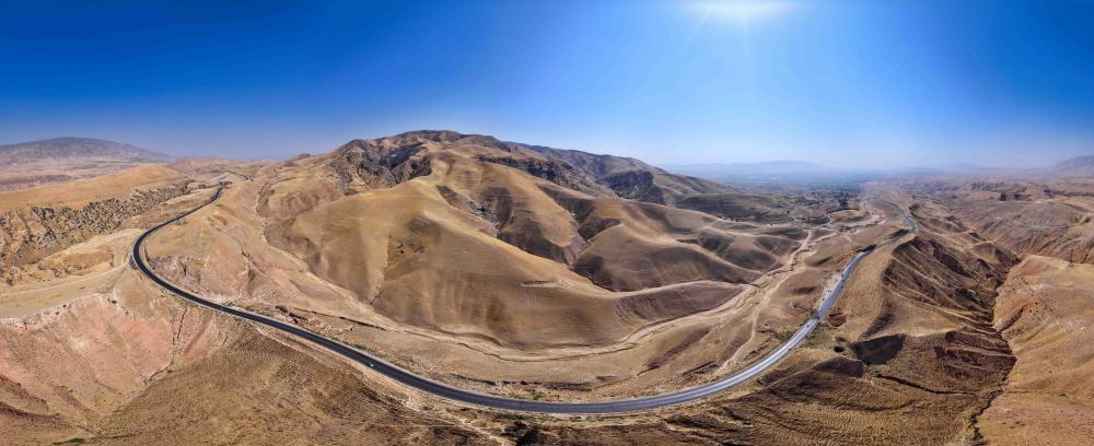 这是在塔吉克斯坦哈特隆州拍摄的中塔公路一期路段(无人机全景照片)。