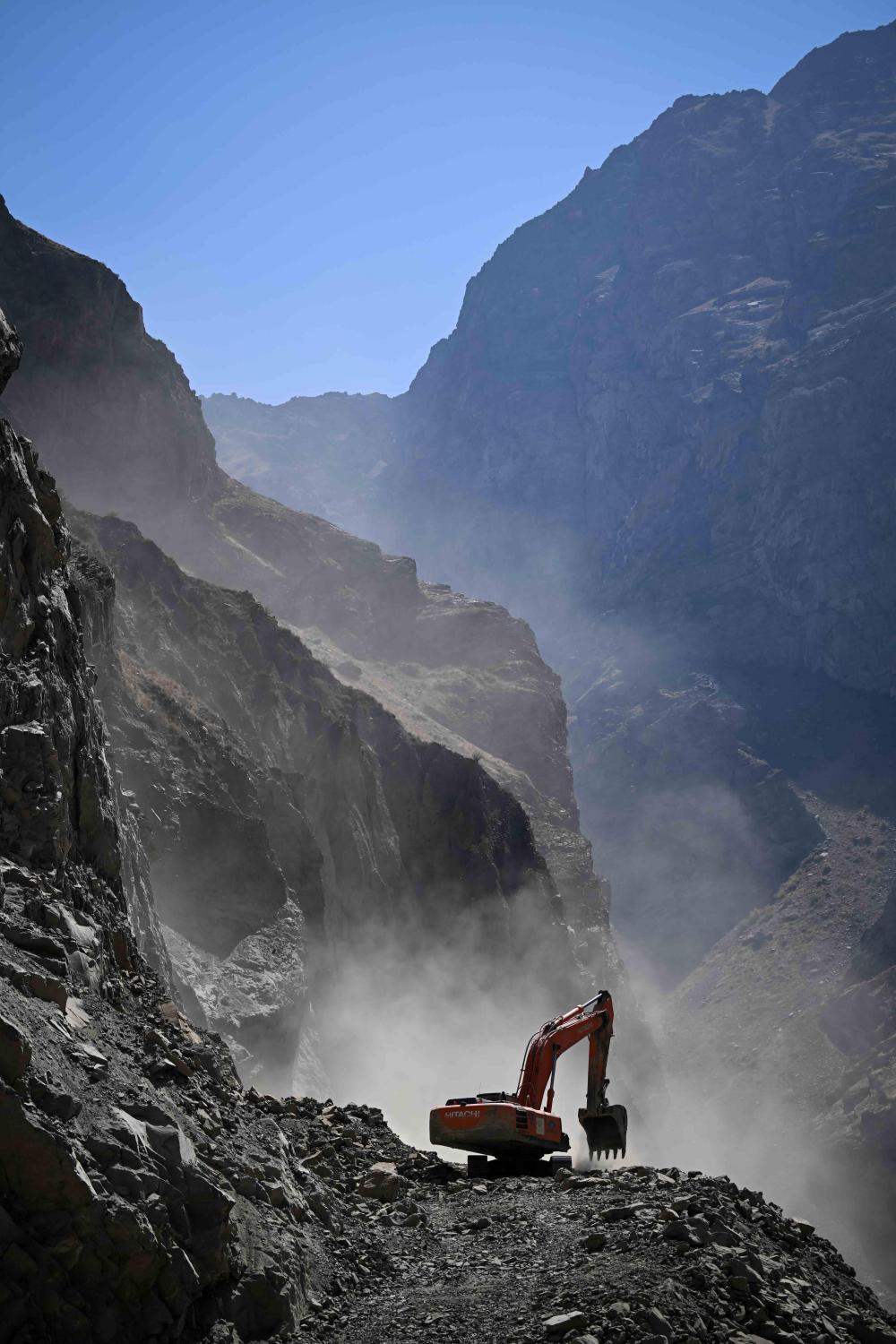 这是在塔吉克斯坦卡拉依洪姆村附近拍摄的中塔公路二期工程施工现场。