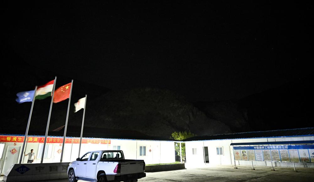 夜幕降临,中国路桥基地里竖立的中塔两国国旗格外醒目。