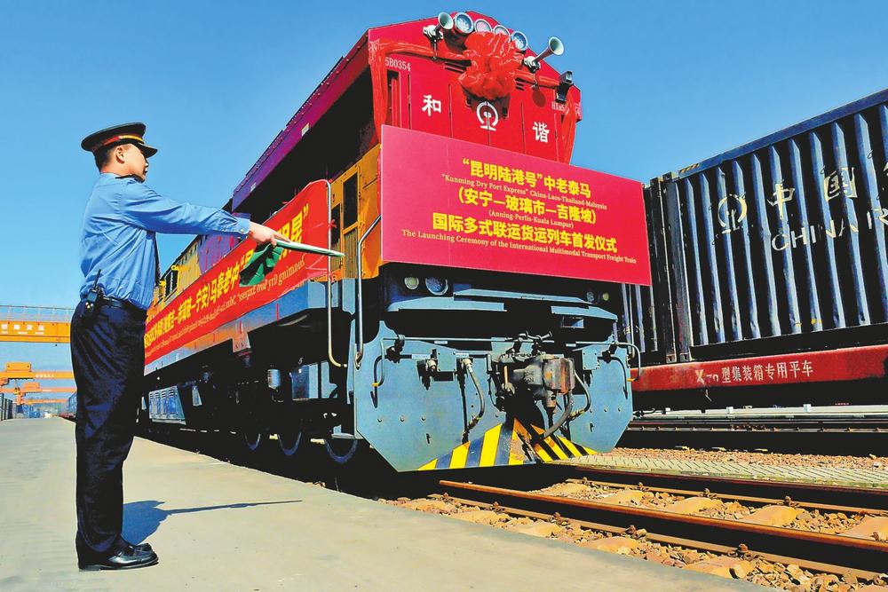 11月28日,“昆明陆港号”中老泰马国际多式联运列车首发仪式在安宁桃花村货运站举行,标志着区域互联互通与面向印度洋的国际物流大通道建设取得新进展。