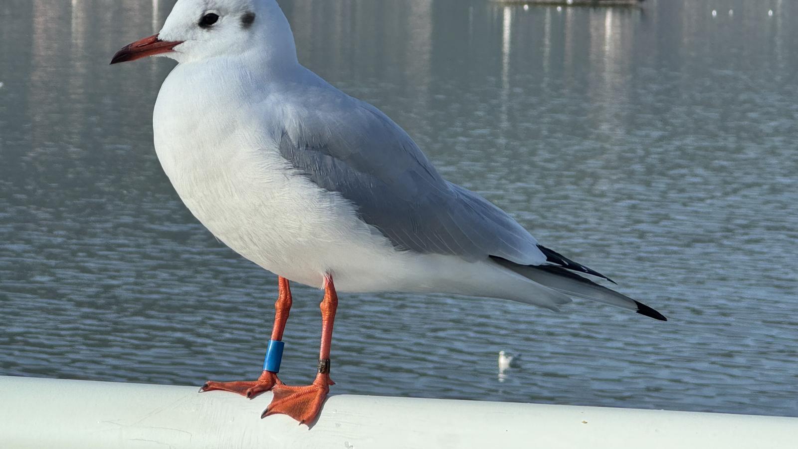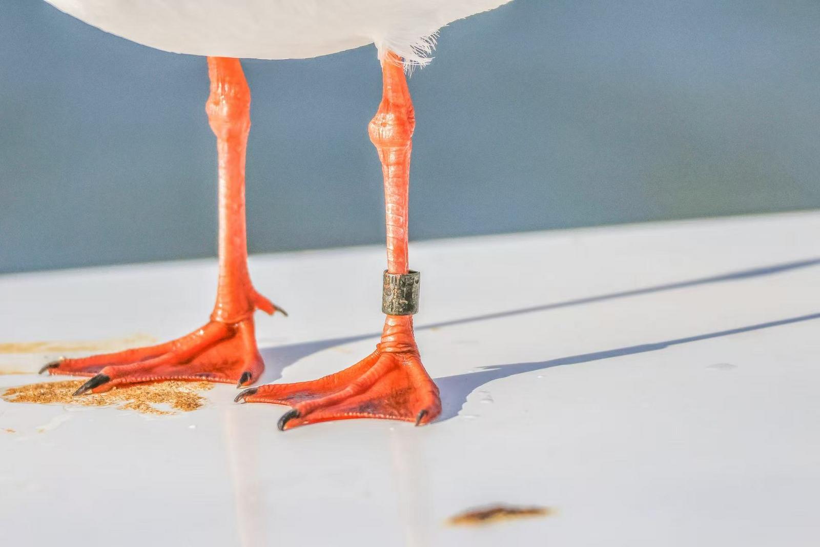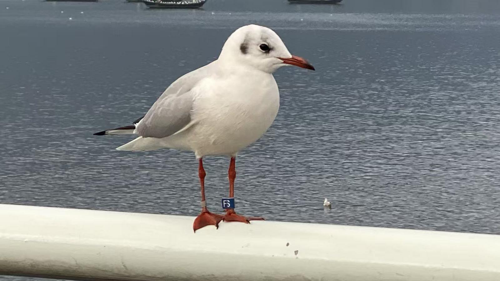 11月24日,记者在昆明海埂大坝看到,停在栏杆或柱子上的红嘴鸥,有的脚上佩戴着天蓝色的塑料环,偶尔也能见到脚戴早期金属环的个体,它们共同见证着一场持续近四十年的科学探寻与守护。
