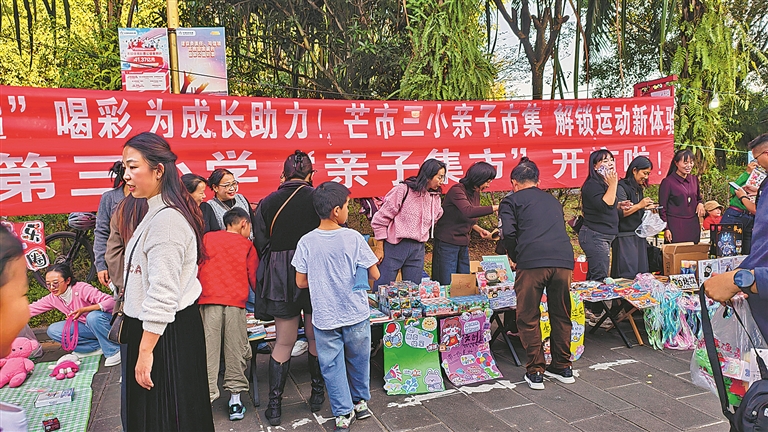 亲子市集聚焦公益性“旧物循环·亲子互动”环保社交主题,芒市三小的学生化身活力满满的“小小摊主”,带着闲置玩具、书籍、手作好物摆起摊位,用“以物换物”的方式传递环保理念、收获交流乐趣。四年级小姑娘唐志瑶的摊位前,妈妈亲手制作的精美发饰与小巧挎包整齐摆放,她略带羞涩地主动与询价顾客交流介绍,脸上满是认真模样:“哥哥进场看球赛,我就在场外守着摊位,给市集添点热闹!”稚嫩的话语里满是热情,成为亲子市集里一道暖心风景线。