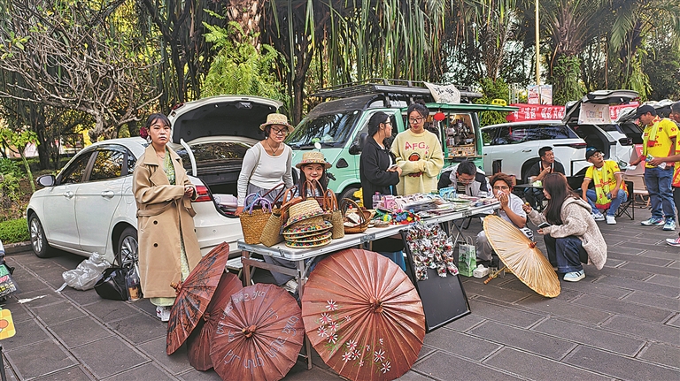 后备箱市集则尽显创意巧思,一排排汽车后备箱敞开变身“移动潮店”,是潮流好物聚集地,也是网红打卡新地标。醇香咖啡、清新石斛花、特色民族文创手作等商品错落摆放,每一件都藏着摊主的审美与心意。对摊主们而言,销量并非首要目的,精心布置摊位、打造浓郁德宏风情打卡点,与往来游客分享本地特色、传递生活热爱,才是这场市集之旅的核心意义。
