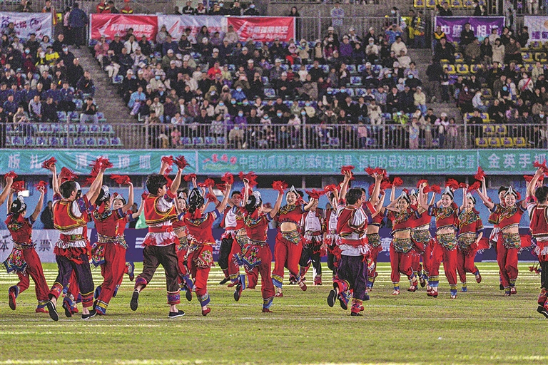 客队红河也带来精心准备的彝族歌舞《马缨花》,欢快舞步、嘹亮歌声回应着暖冬德宏的热情与包容,每一个动作、每一段旋律都传递着两地情谊,收获热烈掌声,民族风情与体育热忱在此刻完美交融。